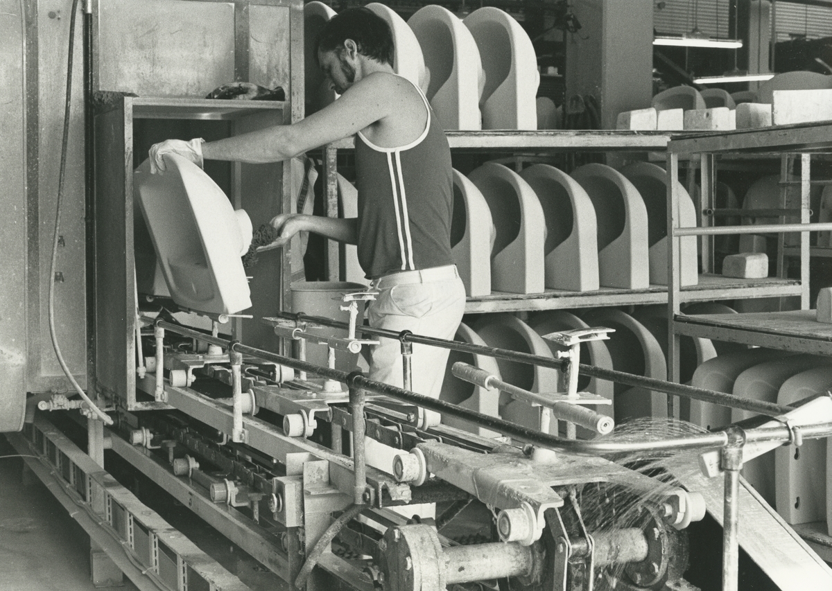Titel: Interiör, Sanitetsporslinsfabriken. Putsning och avtorkning av handfat. Personer: okänd