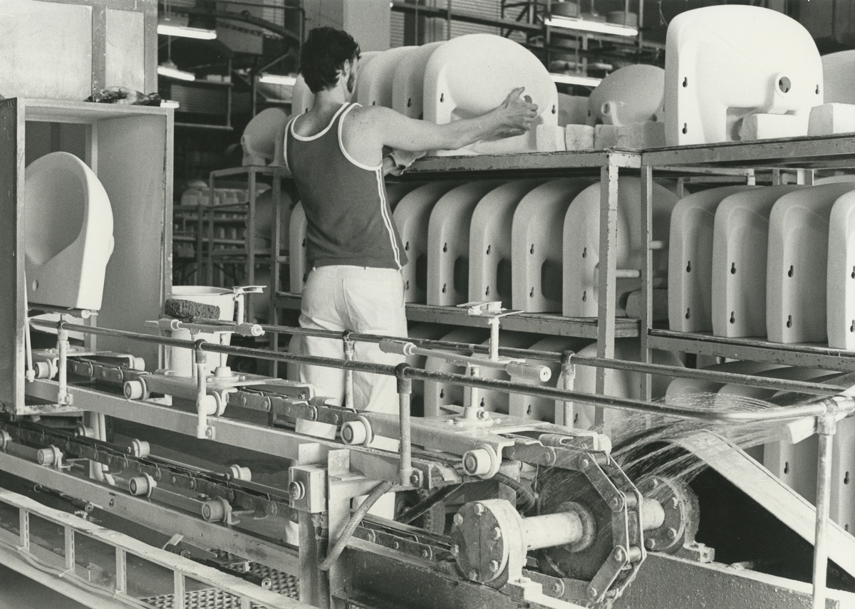 Interiör, Sanitetsporslinsfabriken. Hantering av putsade och avtorkade handfat.