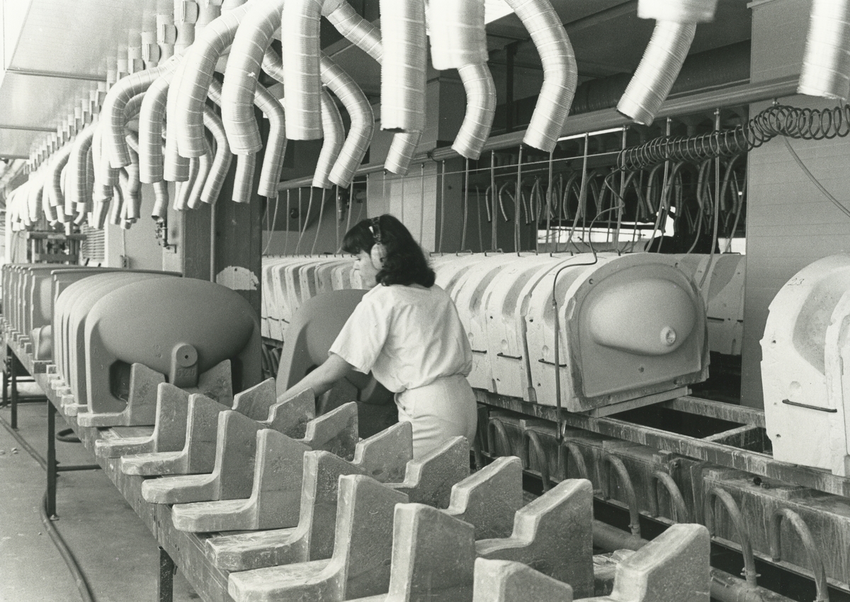Interiör, Sanitetsporslinsfabriken. Hantering av gjutna handfat för torkning.