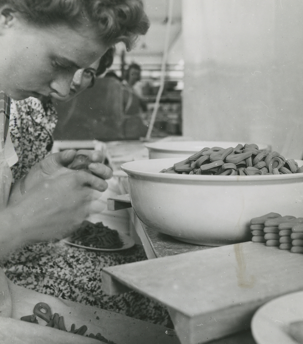 Interiör. Närbild på fabriksarbeterska från Hushållsporslisfabriken. Hänklar för koppar putsas och synas innan de fastsätts.