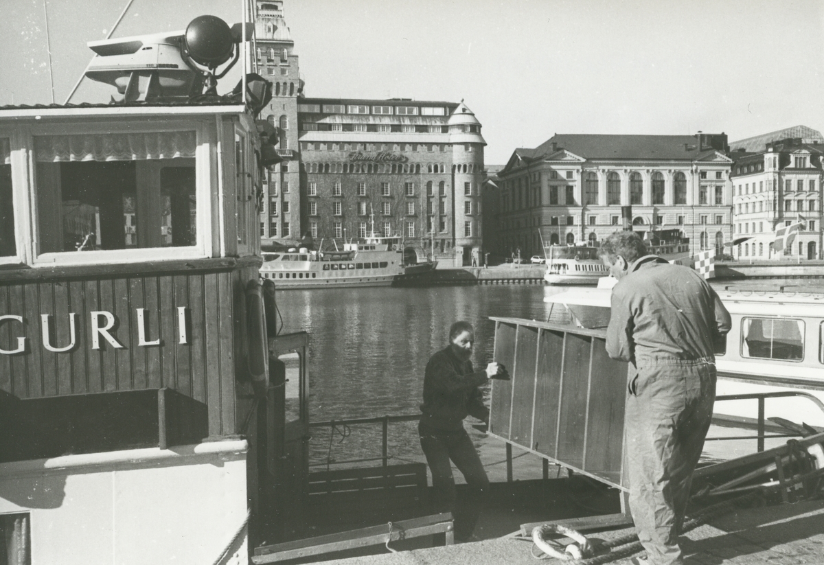 Exteriör. Inlast av bokhyllor på Bokbåten Gurli. Nybroviken.