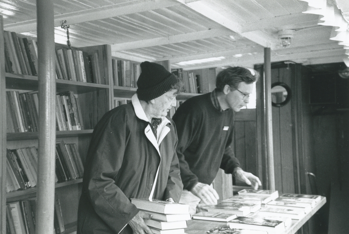 Interiör. Bokbåten Gurli. Bibliotekarie och låntagare.