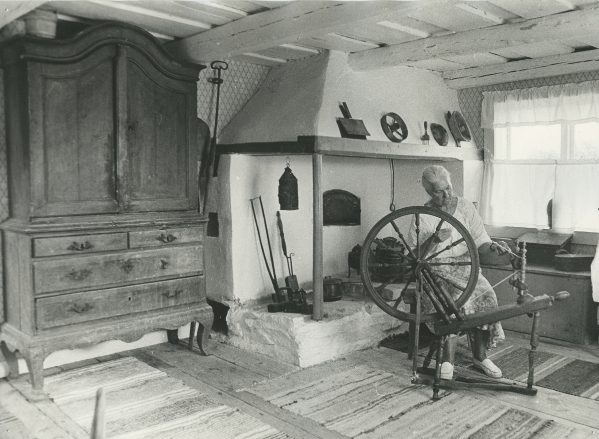 Interiör. Möja Museum. Förevisning av hur man spinner ull, en vanlig syssla förr.