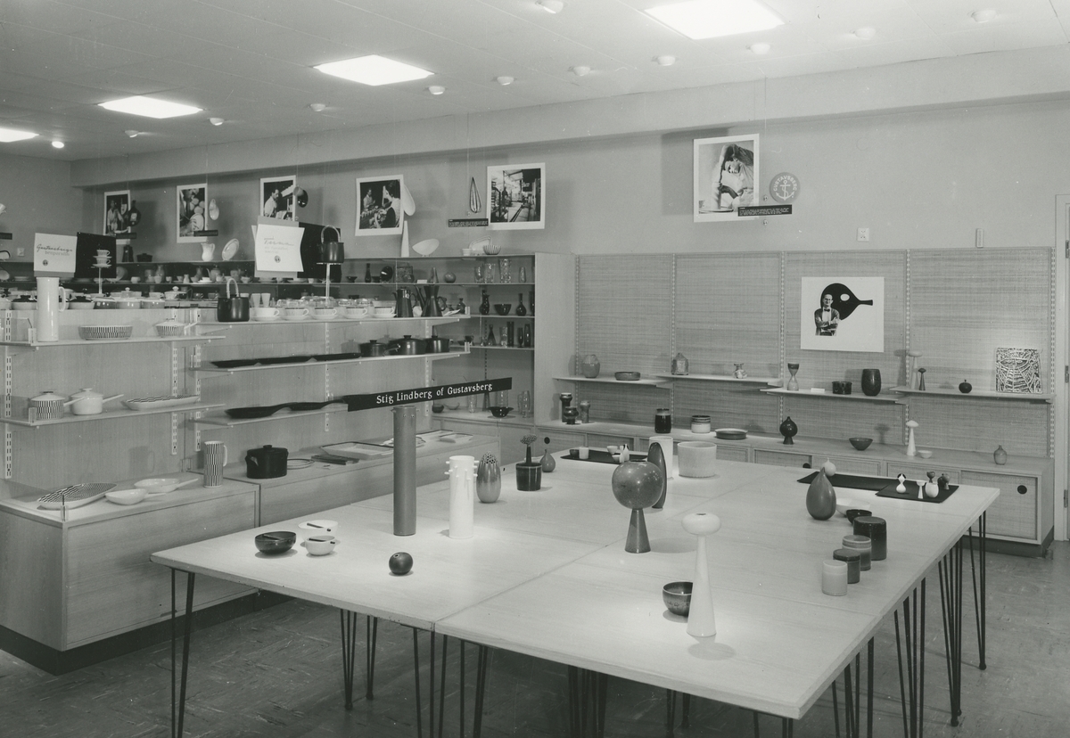 Utställning av hushållsporslin och stengodspjäser från Gustavsbergs Fabriker. Okänd plats.