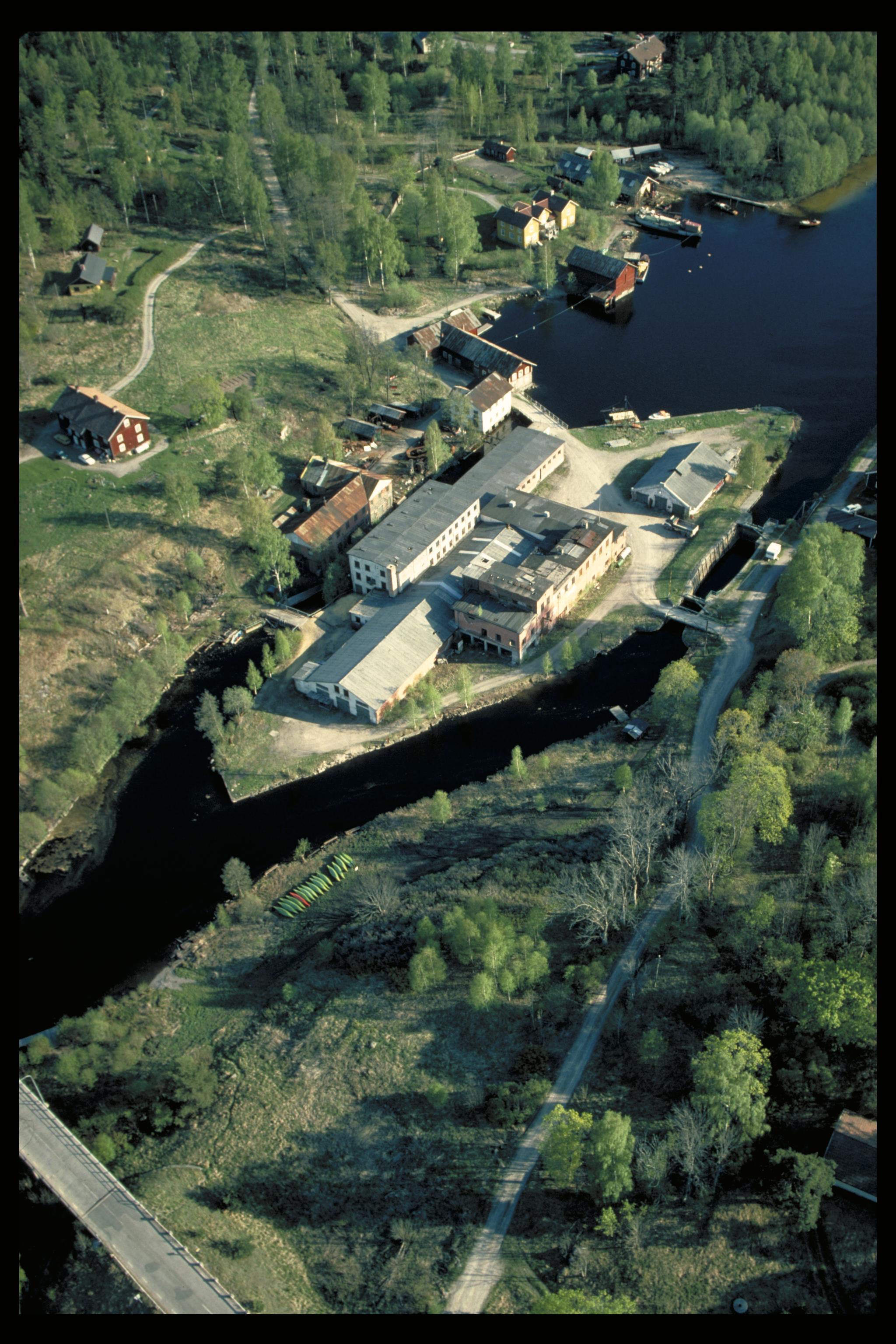 På platsen finns/fanns bland annat såg och kvarn, tillverkning av stångjärn samt pappersmassa. Bilden troligen från omkring 1980.