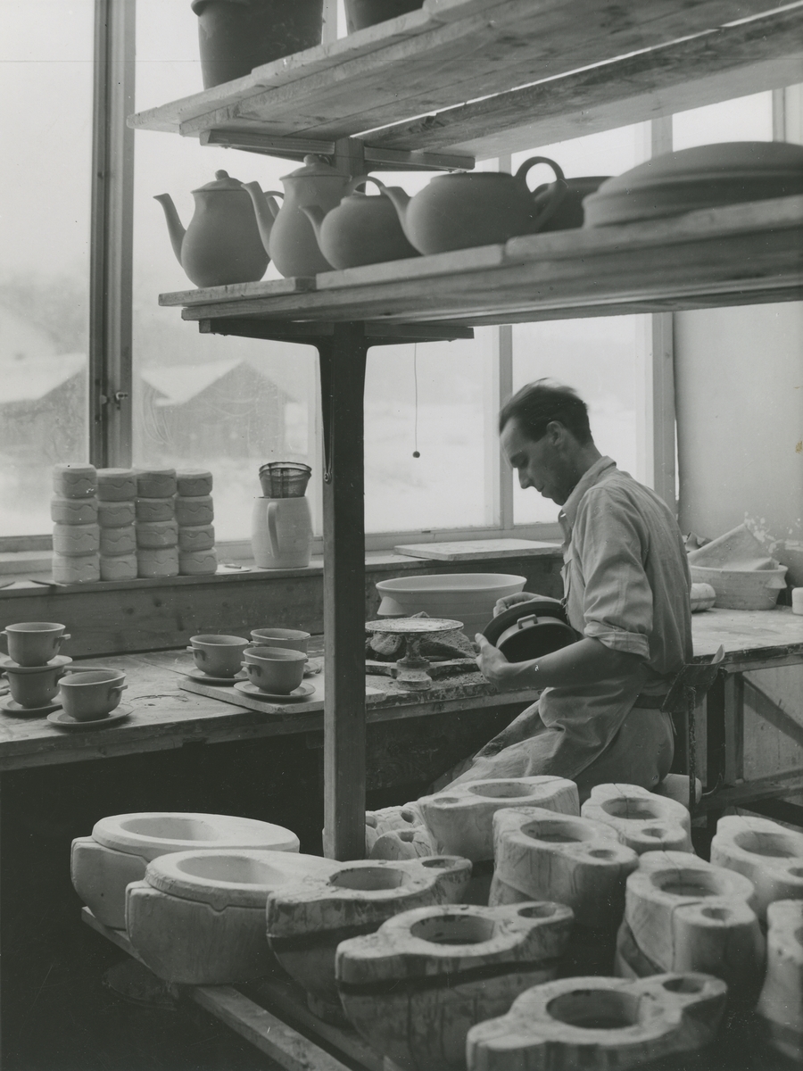 Titel: Interiörbild. Gustavsbergs Fabriker. Gjutning av servisgods. Flintgodsavdelningen, Hushållsporslinsfabriken. Sannolikt 1940-tal. Personer: Okänd arbetare.