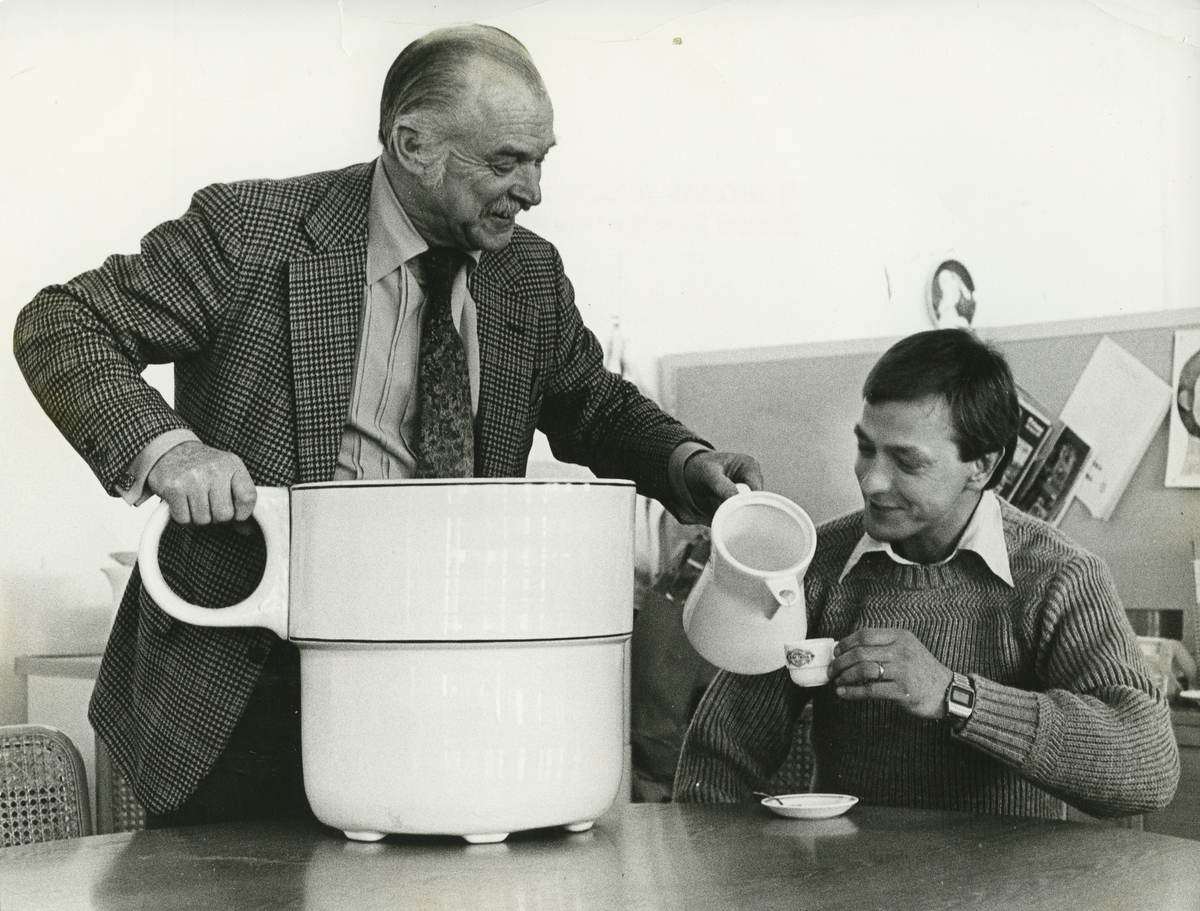 Interiörbild. Mats Eriksson ochThorsten Drewerth med jättekopp, modell från Gustavsbergs Fabriker. Plats okänd.