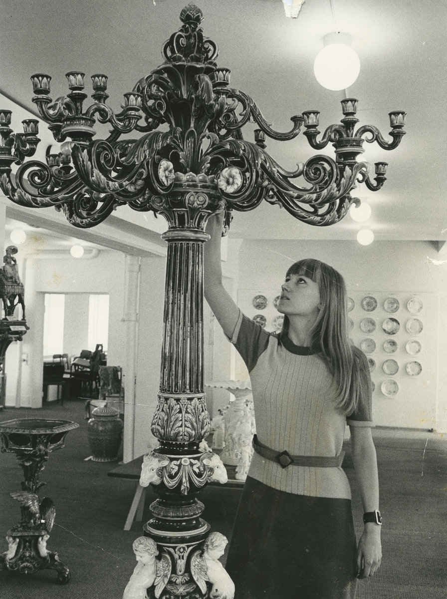 Interiörbild. Sannolikt Gustavsbergs Porslinsmuseum,1969. Marianne Landqvist, informationsansvarig på Gustavsbergs Fabriker förevisar en stående kandelaber gjord 1870.