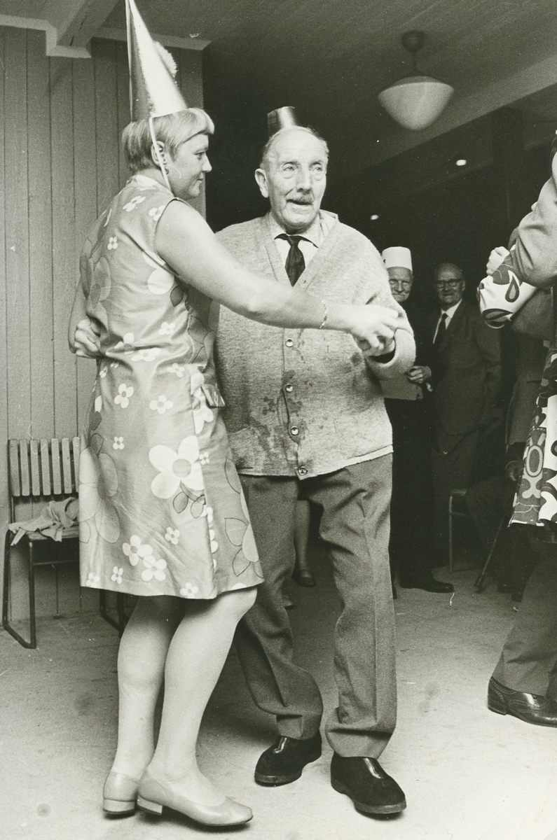 Interör. Dans i samband med festlighet. Sannolikt kräftskiva på Gustavsgården 1968.