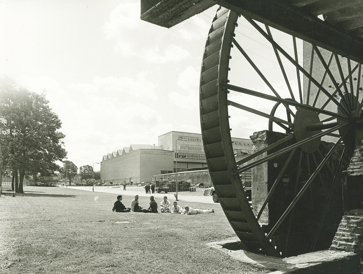 Exteriör. Vattenhjulet. Rastande fabriksarbetare.