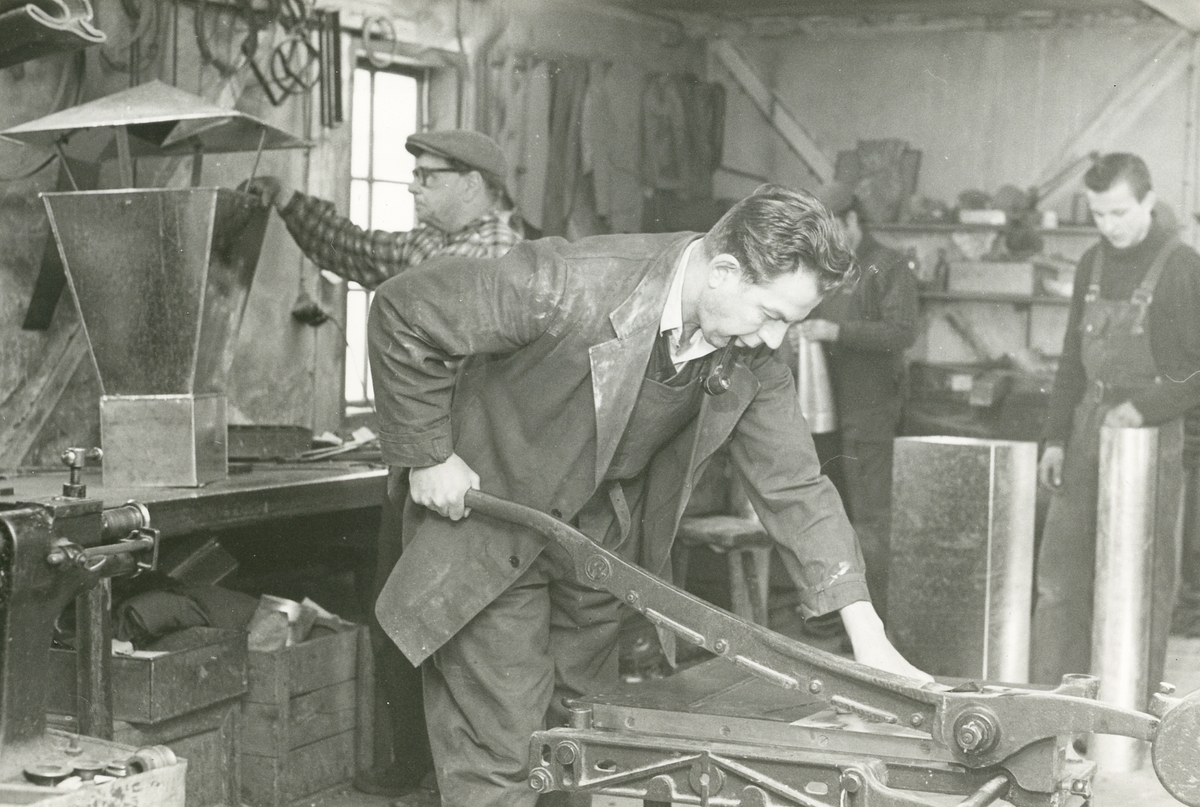 Interiör. Plåtslagare i plåtslagarverkstaden, smedjan.