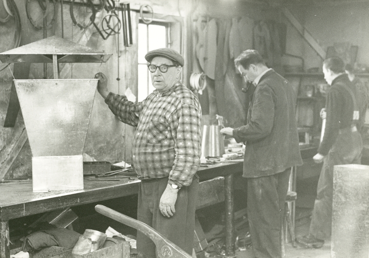 Interiör. Plåtslagare i plåtslagarverkstaden, smedjan.