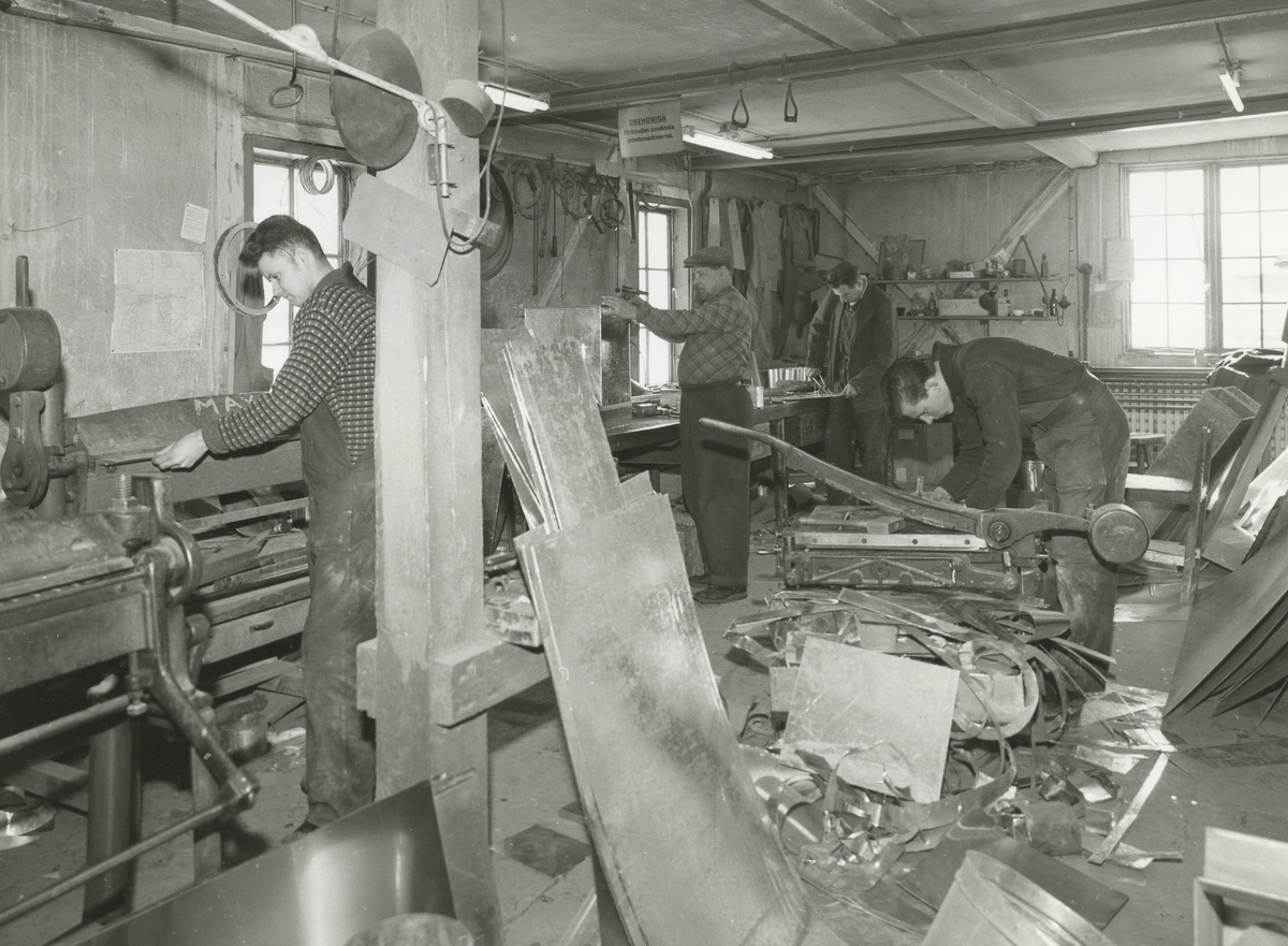 Interiör. Plåtslagare i plåtslagarverkstaden, smedjan.