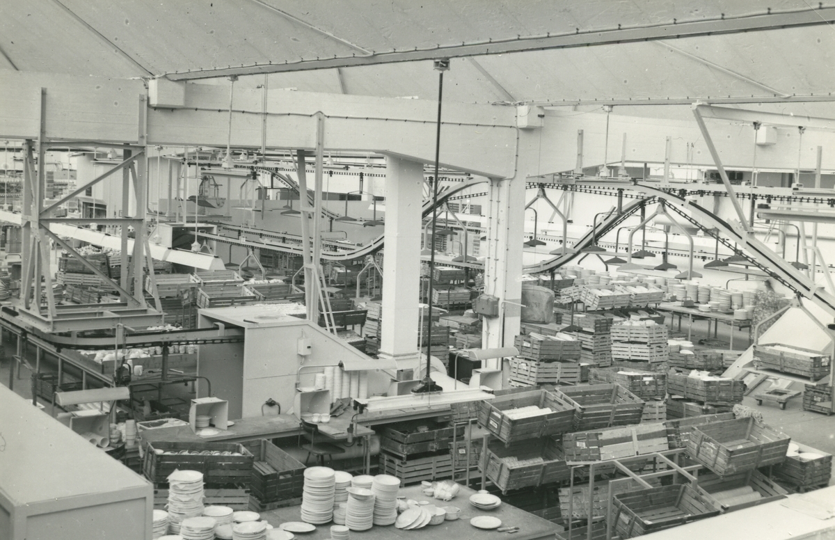 Interiör. Maskinell frakt av lådor med gods till utlasningsutrymme, Hushållsporslinsfabriken.