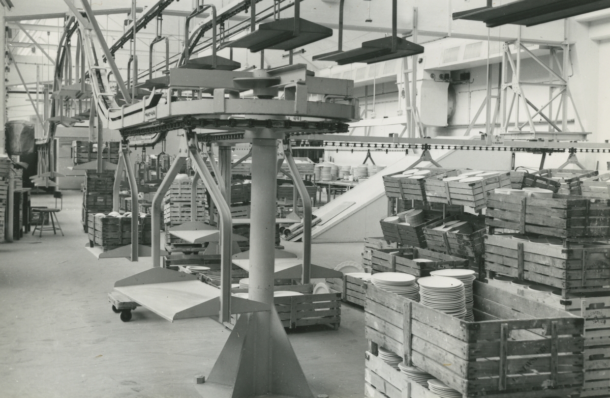 Interiör. Maskinell frakt av lådor med gods till utlasningsutrymme, Hushållsporslinsfabriken.