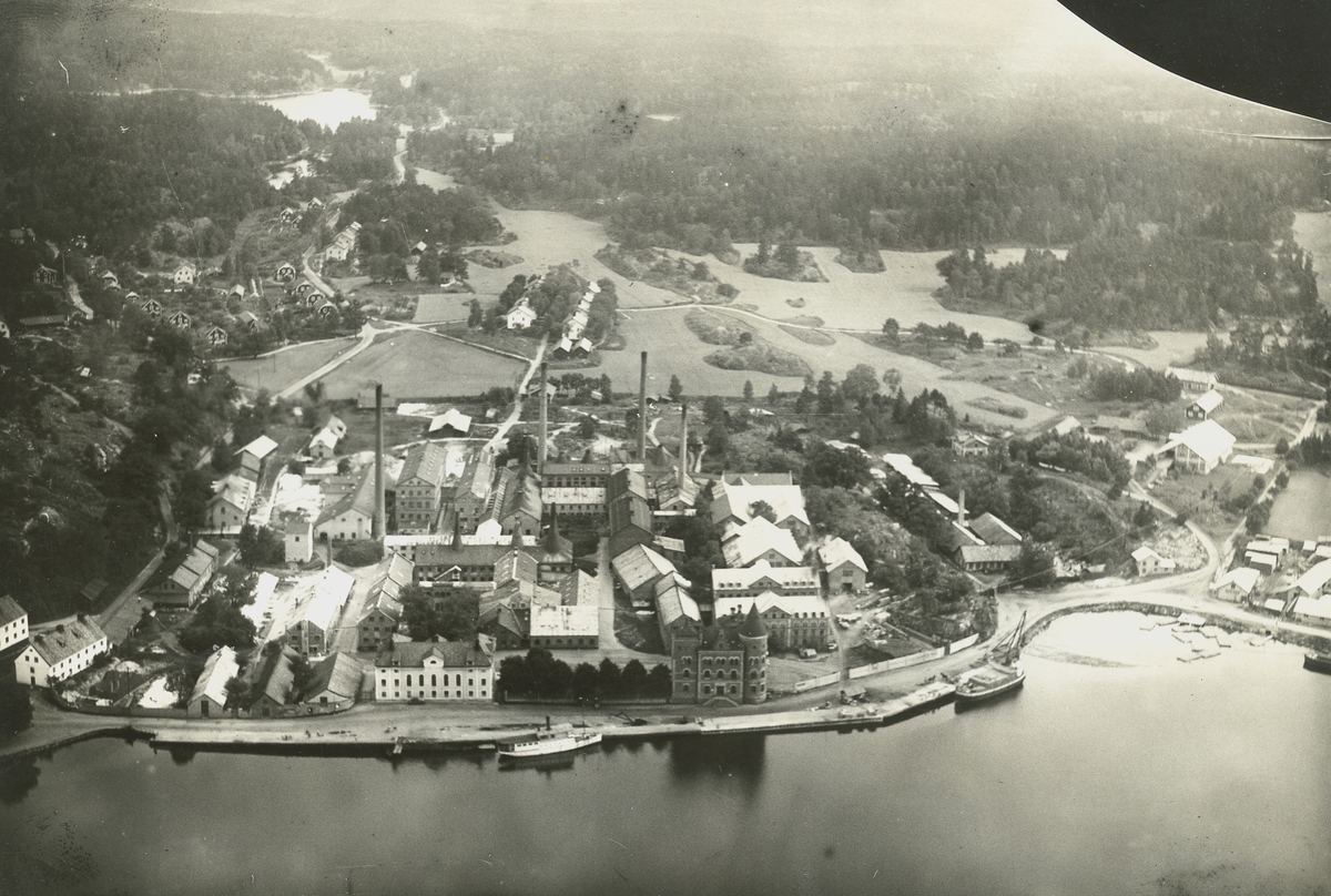 Titel: Exteriör. Flygfoto över Gustavsbergs fabriksområde med omnejd. Sannolikt från 200 m höjd.