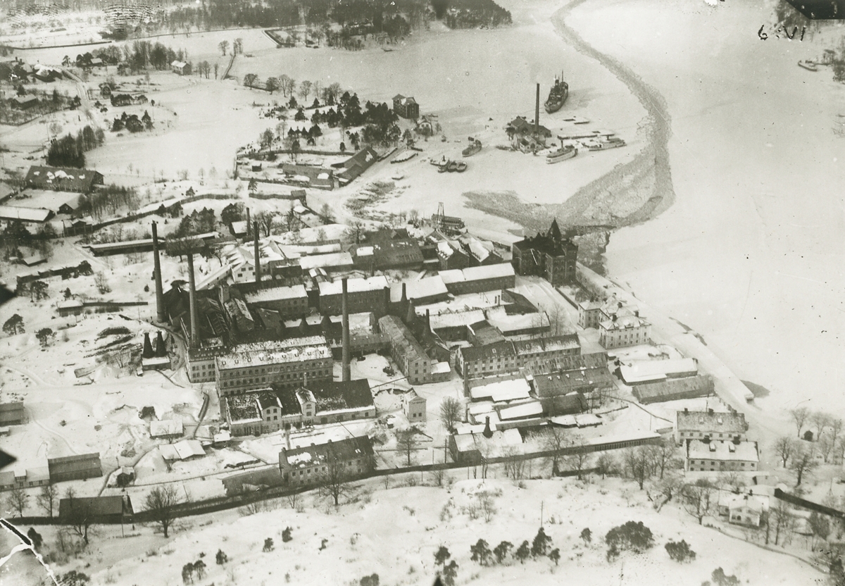 Exteriör. Flygfoto över Gustavsbergs fabriksområde vintertid, 1929.