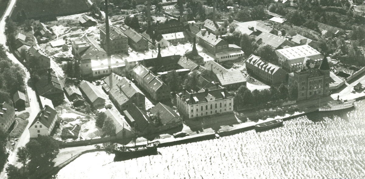 Exteriör. Flygfoto över Gustavsbergs fabriksområde och del av Farstaviken.