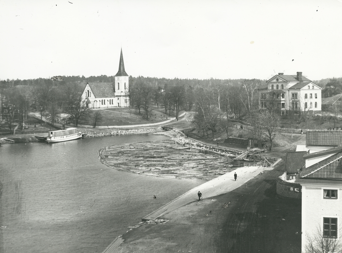 Exteriör. Veddrivning. Farstaviken, Gustavsbergs kyrka och värdshuset i bakgrunden.