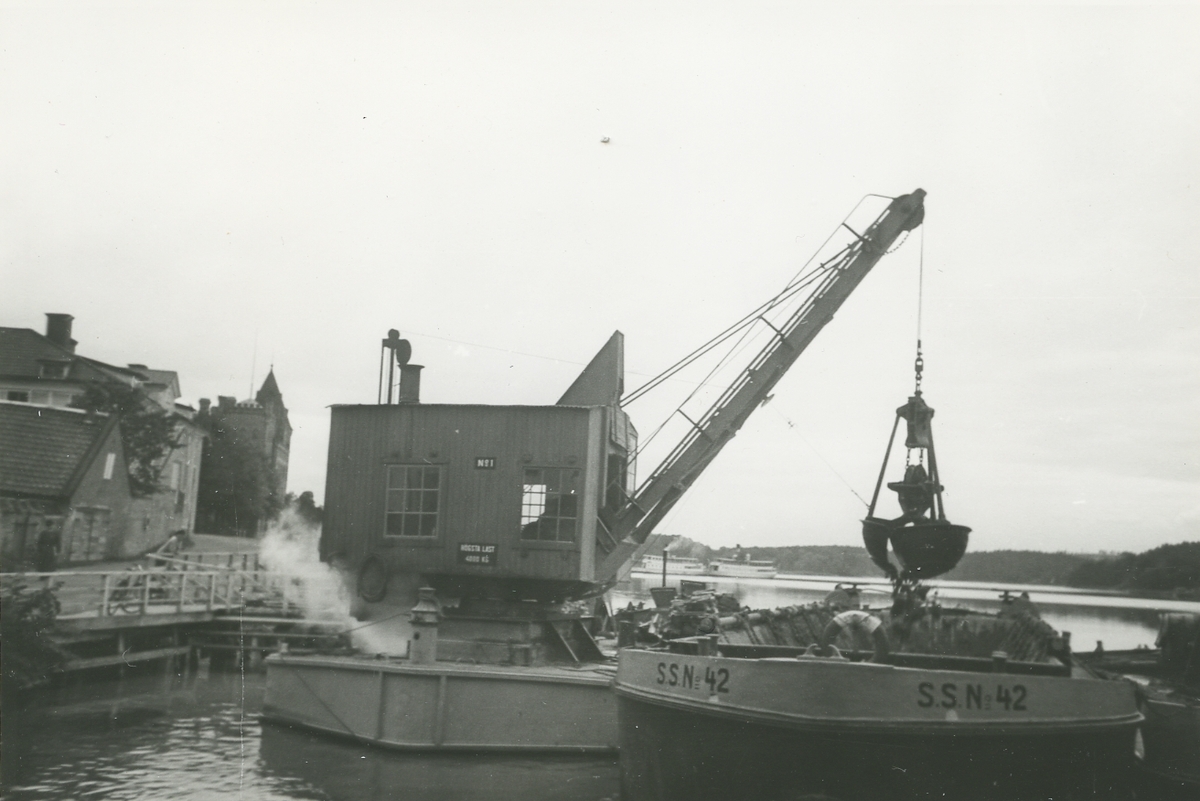 Exteriör. Ångdrivet mudderverk för muddring vid Varma rännan Farstaviken. Muddermassorna lastas på pråmar.
