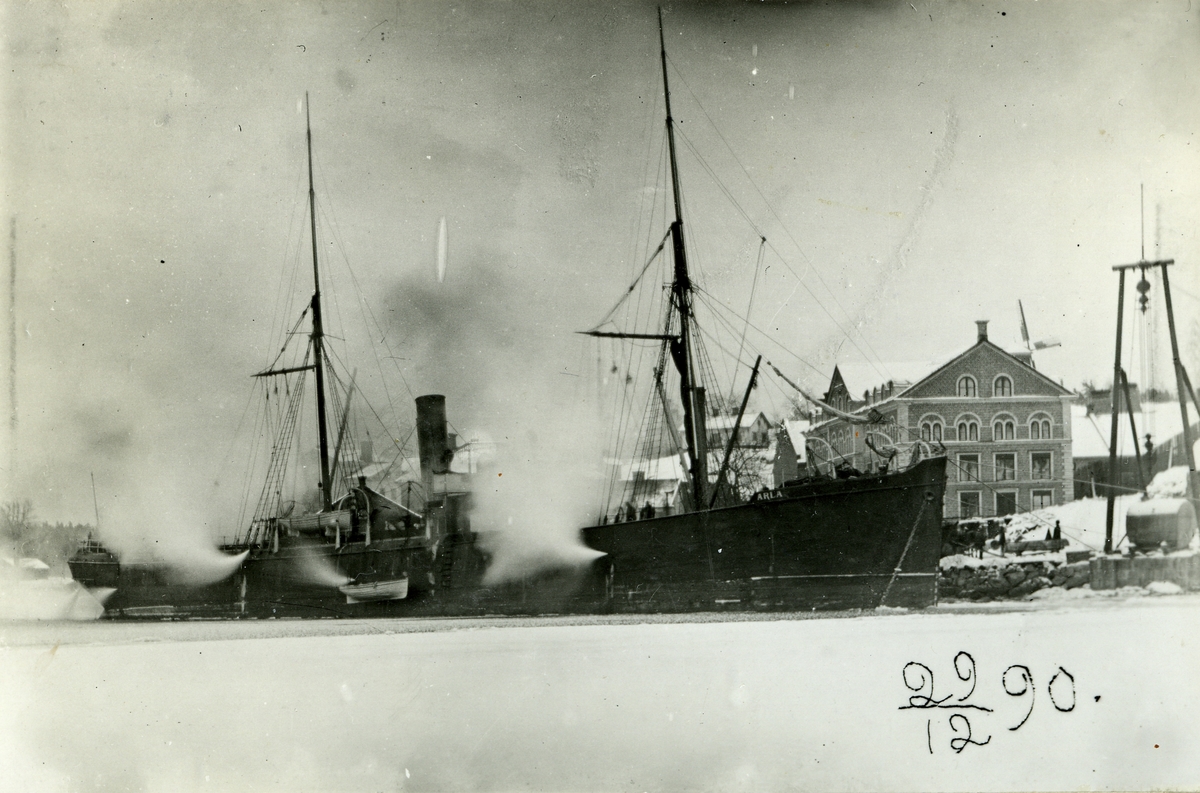 Lastångare vid kajen och främre Packboden i bakgrunden till höger.