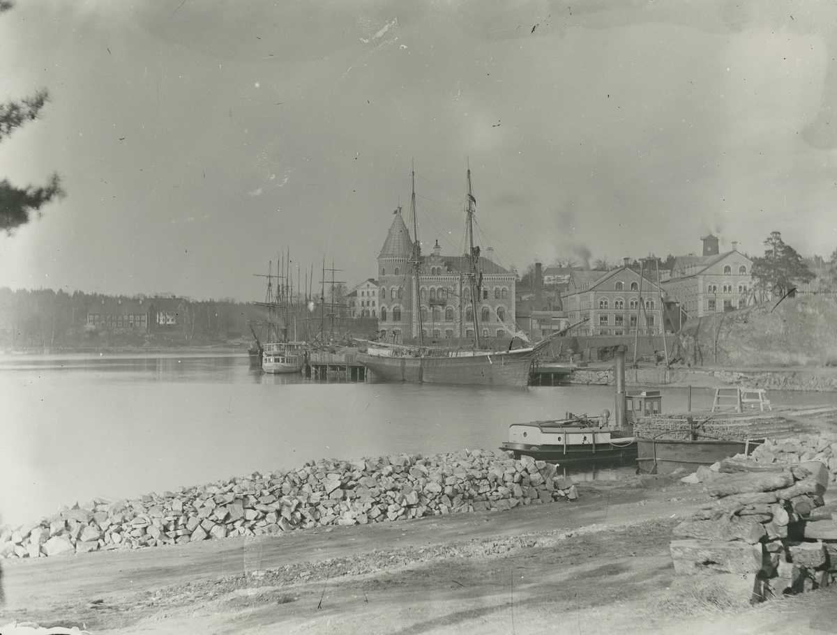 Lastfartyg förtöjda vid lastkajen i Gustavsbergs hamn.