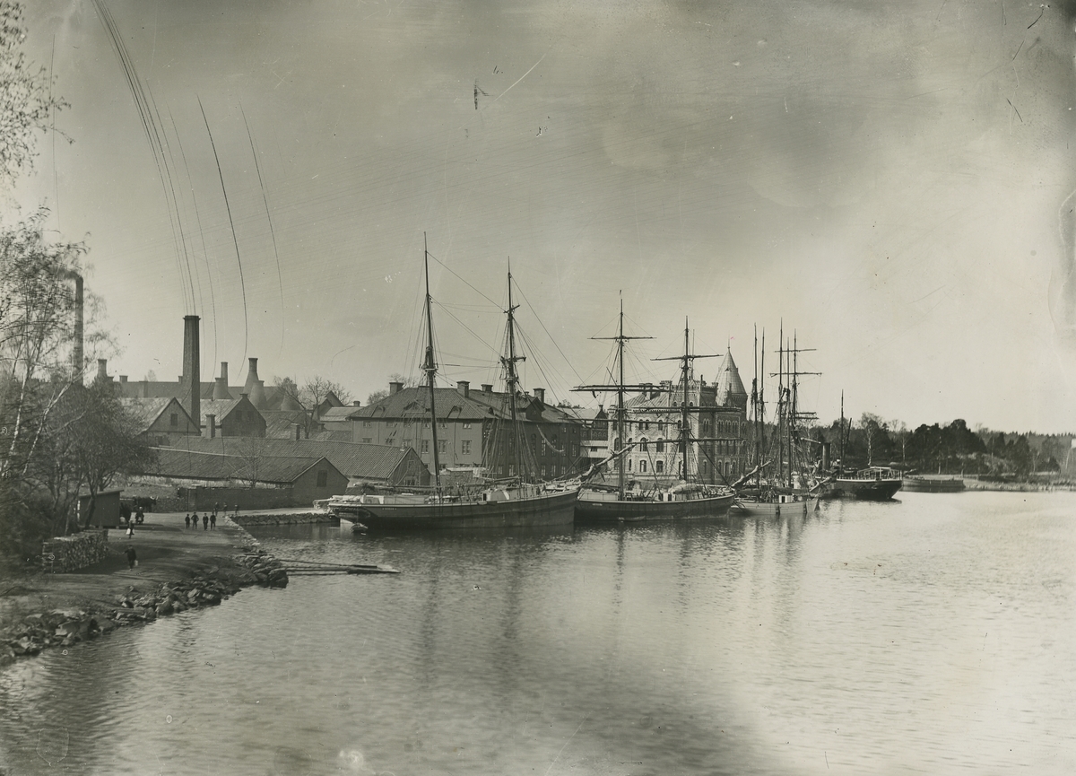 Titel: Lastfartyg förtöjda vid lastkajen i Gustavsbergs hamn.