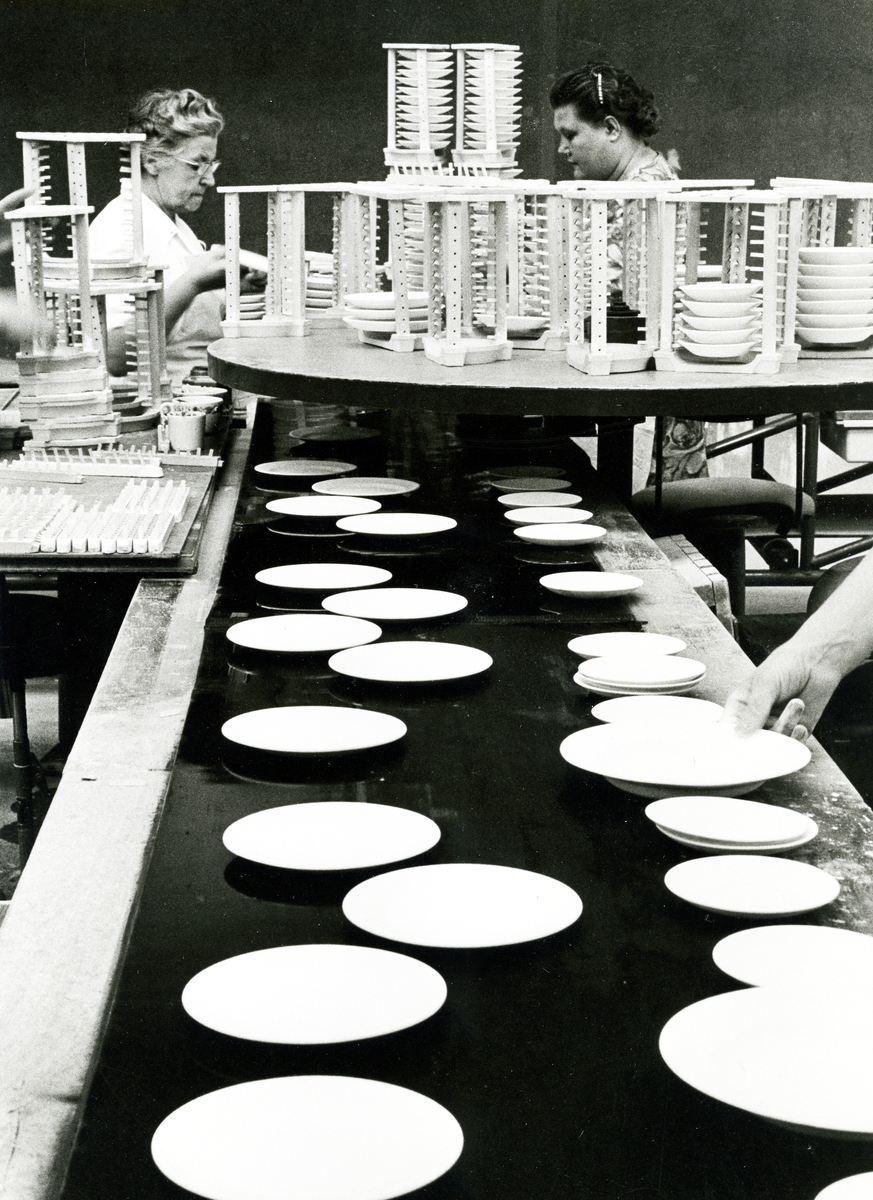 Interiör. Hushållsporslinsfabriken. Avsyning av tallrikar vid löpande band.<br>