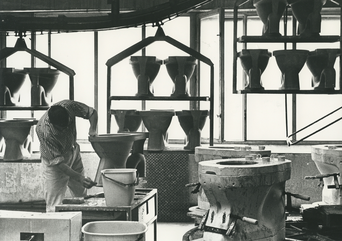 Interiör, Sanitetsporslinsfabriken. Putsning av nygjuten wc-stol.<br>
