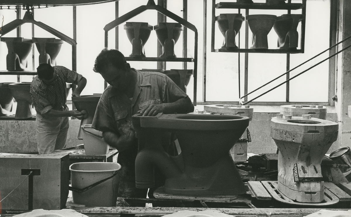 Interiör, Sanitetsporslinsfabriken. Putsning av nygjutna wc-stolar.<br>