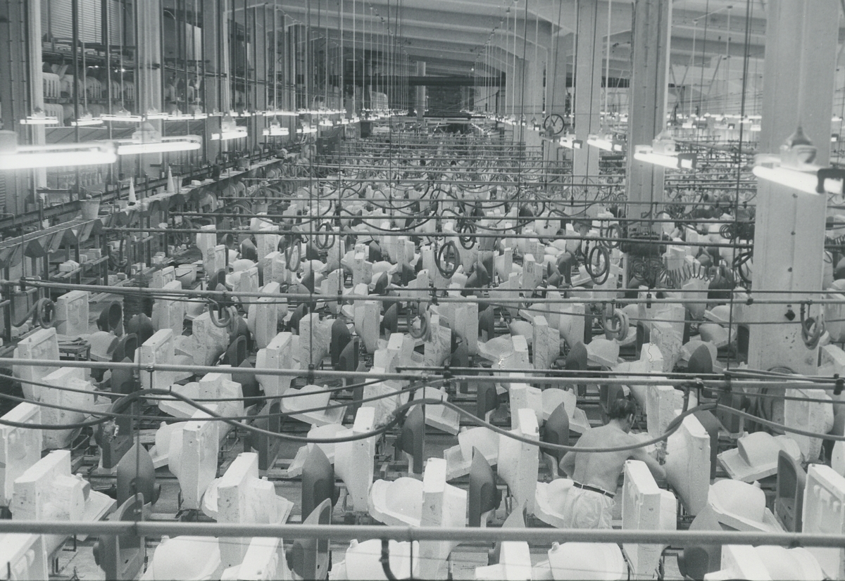 Interiör, Sanitetsporslinsfabriken. Bänkgjutning av handfat.