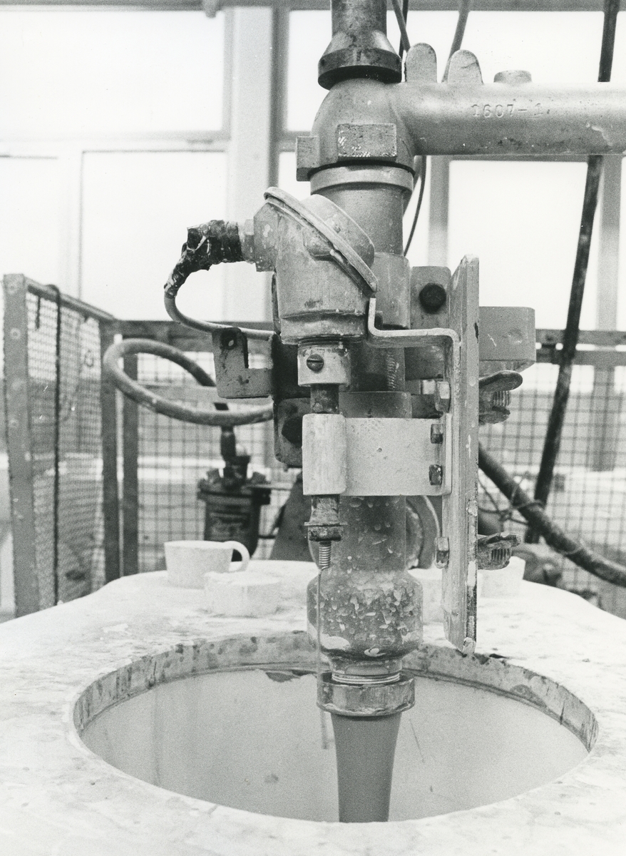 Detaljbild, Sanitetsporslinsfabriken. Maskinell fyllning av gjutmassa i gjutform till wc-stol.