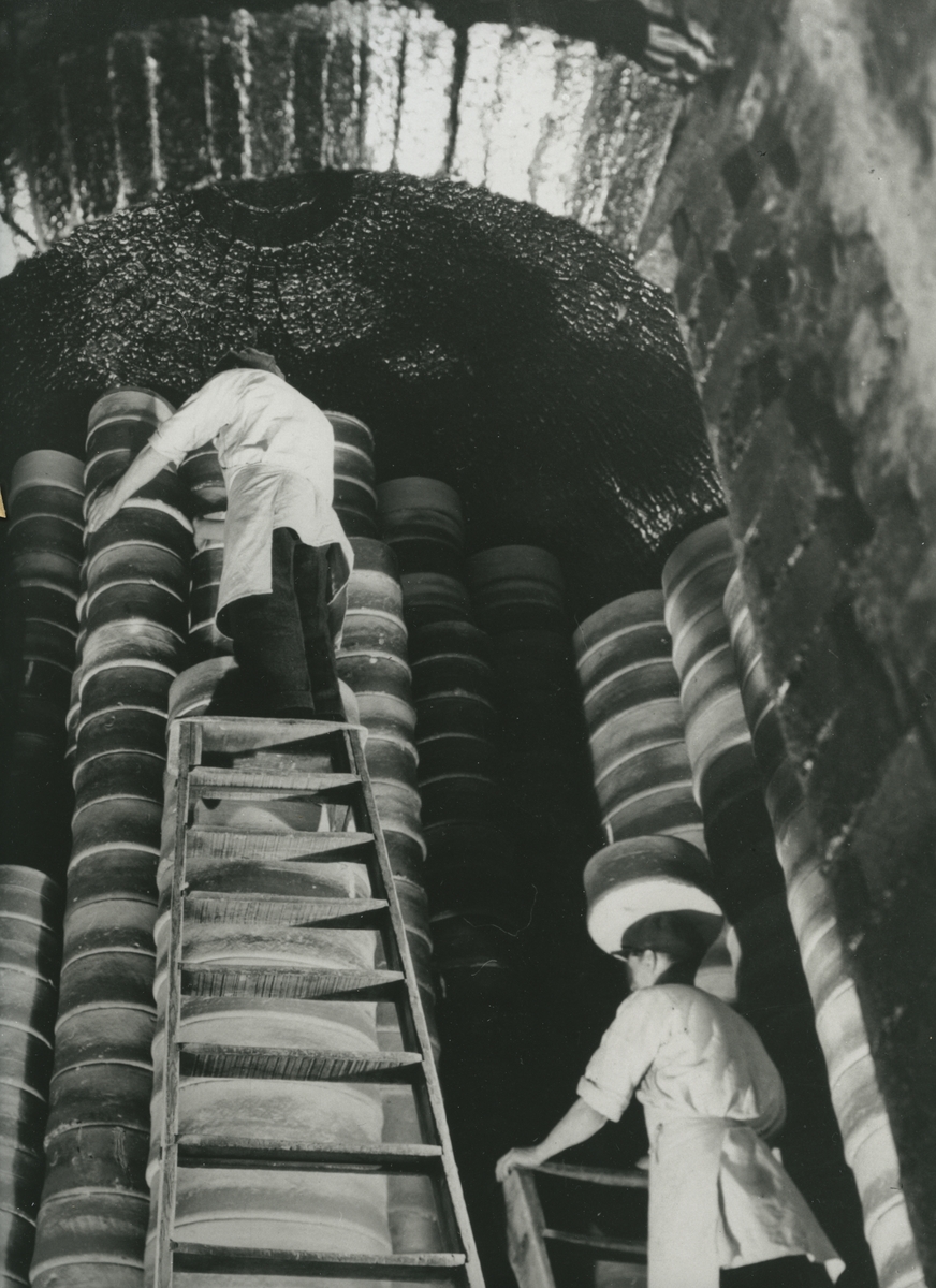 Stapling av kokor, behållare med porslin för bränning i den koleldade ugnen.