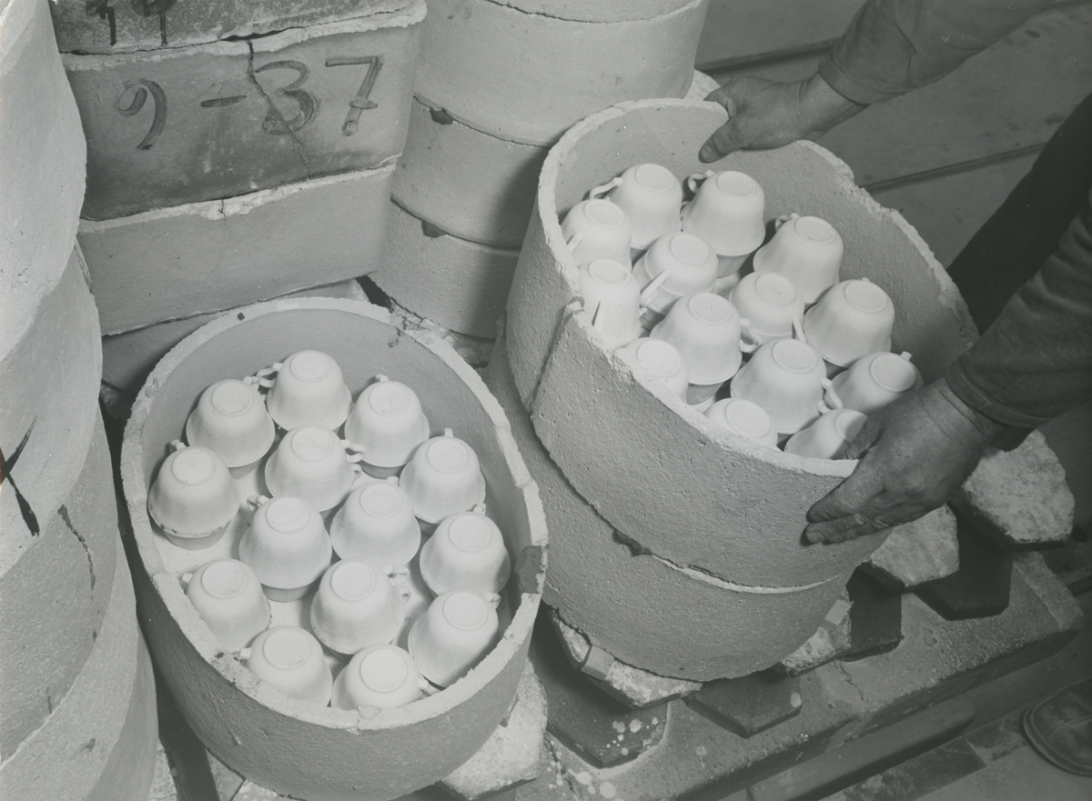 Interiör porslinsfabriken. Packning av kapslar för bränning av porslin.