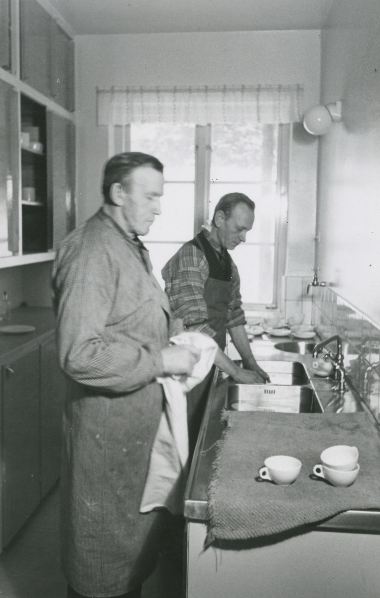 Interiör, bostad. Kök med en modernare typ av diskbänk. Diskande män.