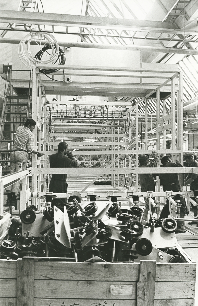 Interiör. Gustavsbergs fabiker. Pågående installation av automatisk rollermaskin med torkskåp för flatgods på hushållsporslinsfabriken.