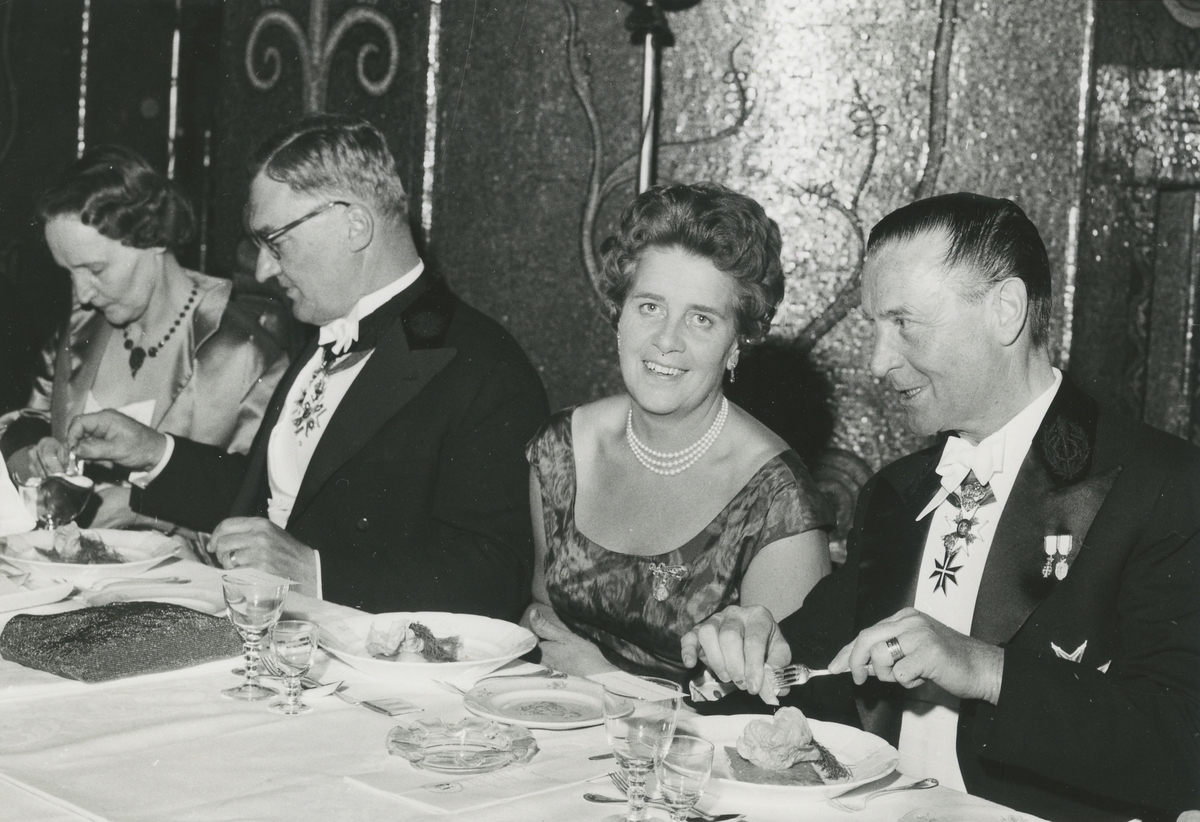 Middagstillställning. Okänd plats. Hjalmar Olson, VD för Gustavsbergs Fabriker och tre okända personer.