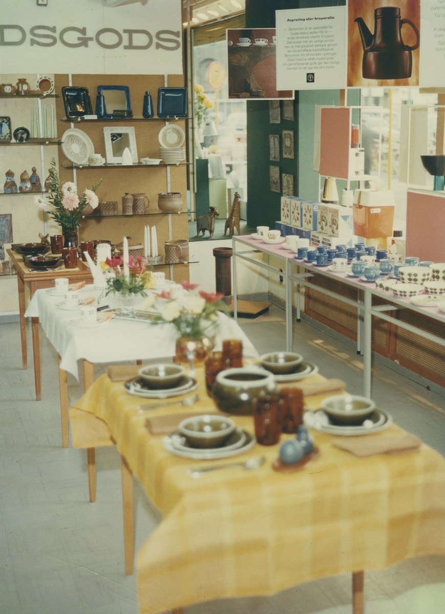 Interiörbild. Utställning av hushållsporslin och prydnadsföremål från Gustavsbergs Fabriker. Okänd plats, sannolikt i varuhus, Göteborg.
