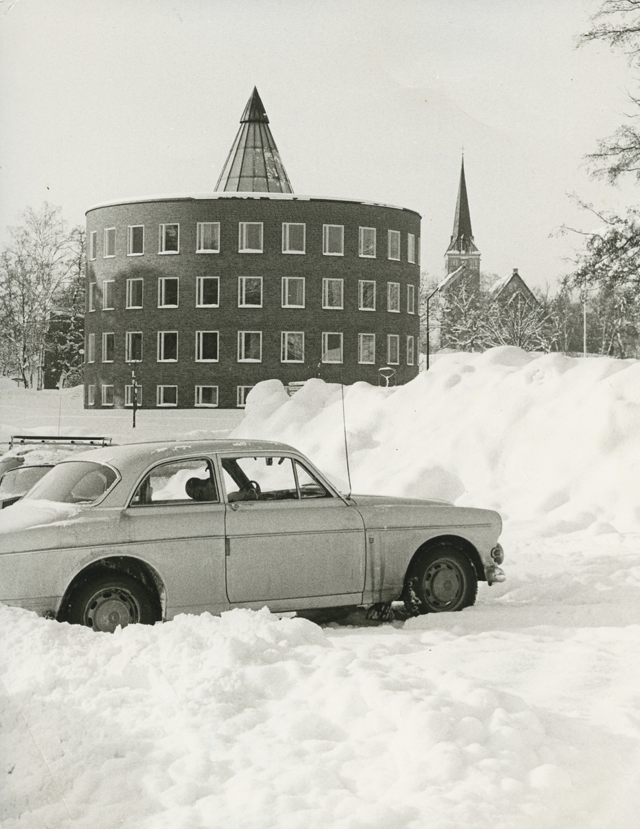Exteriörbild. Kommunalhuset, Runda huset. I bakgrunden Gustavsbergs kyrka. Vintertid.