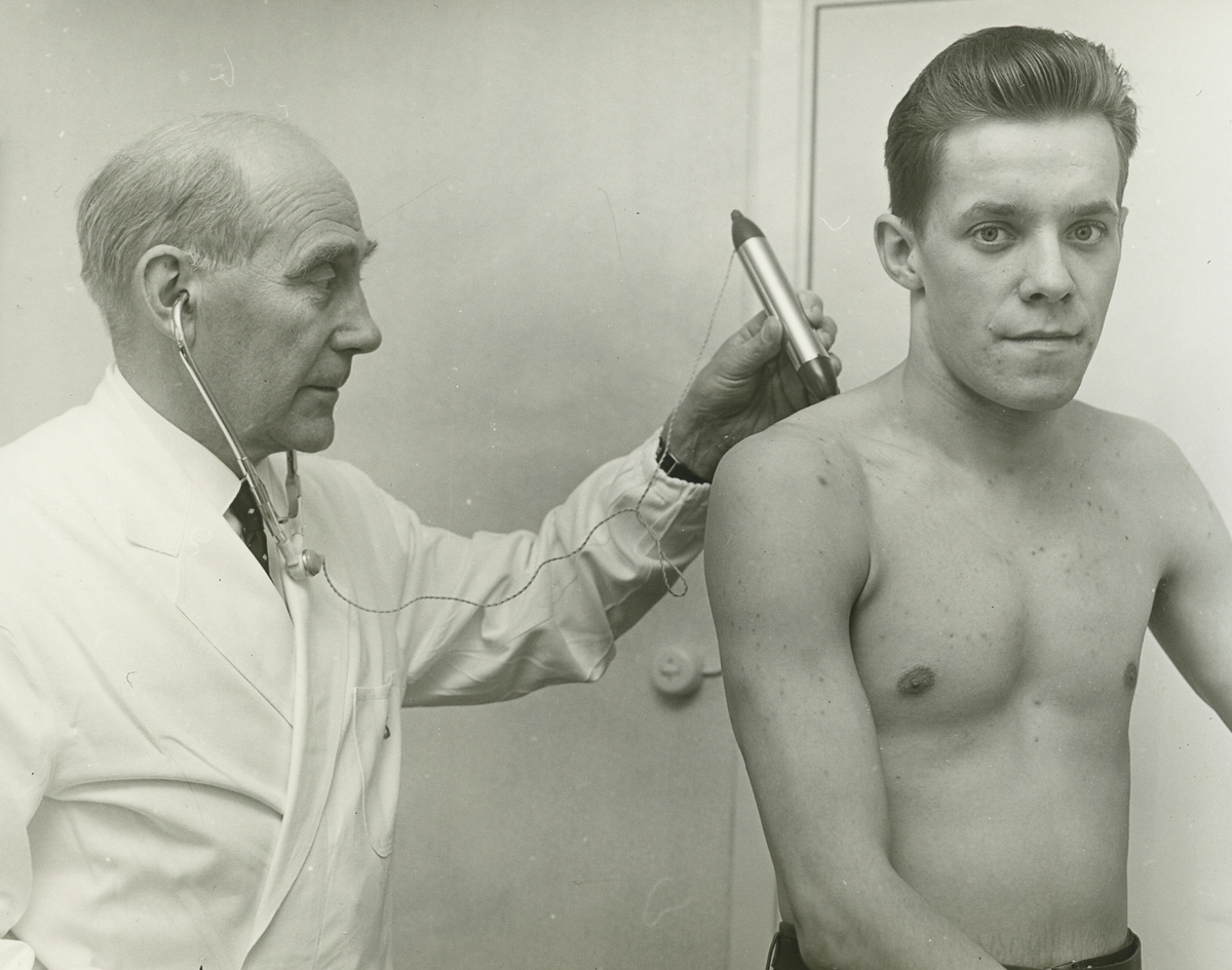 Interiör. Sjukrummet, företagshälsovård på Gustavsbergs Fabriker.. Läkarundersökning av anställd.