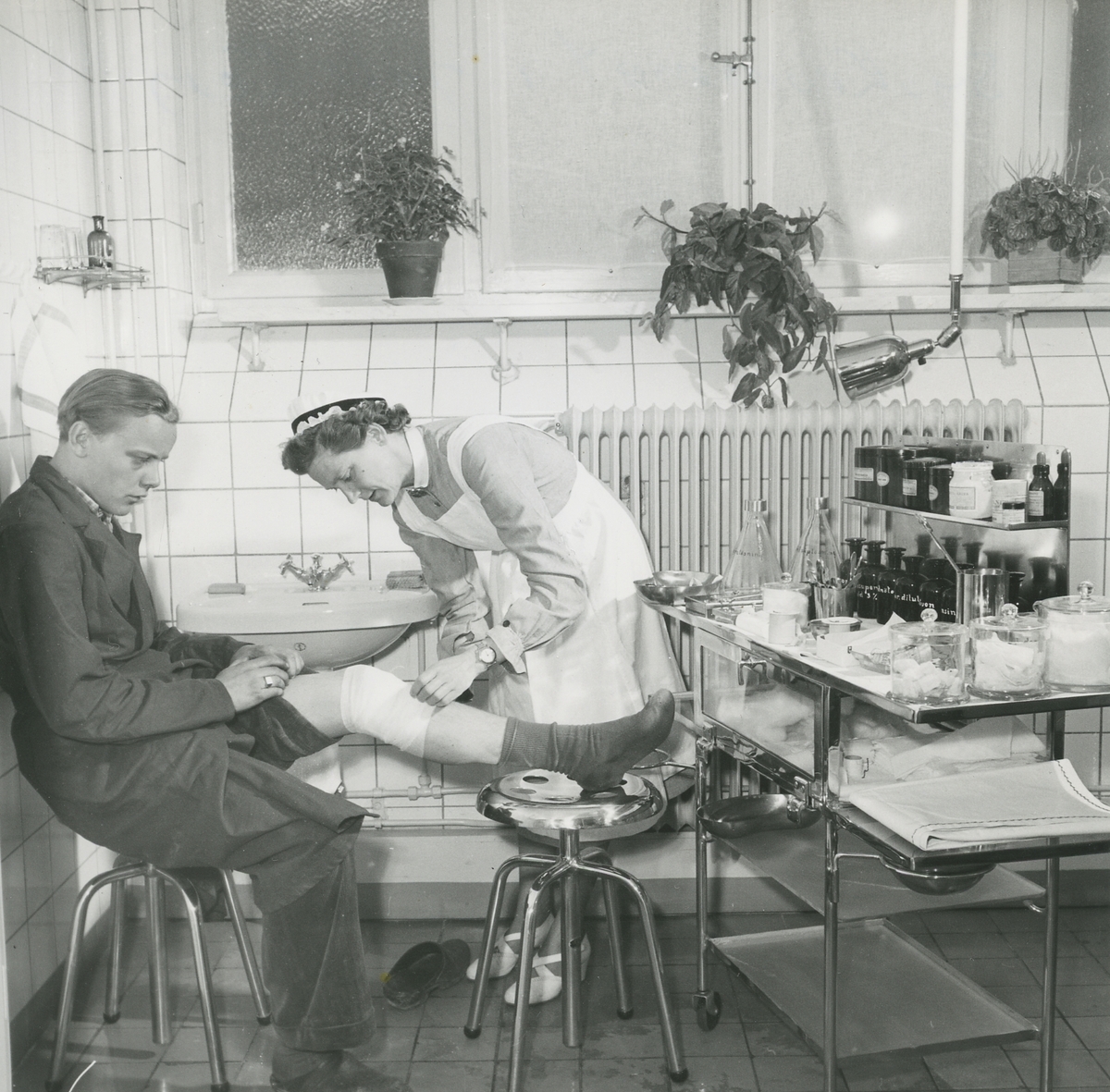 Titel: Interiör. Sjukrummet, företagshälsovård på Gustavsbergs Fabriker. Undersökning av företagets sjuksyster Margit Lindskog-Norberg. Personer: Margit Lindskog-Norberg och Gunnar Norberg