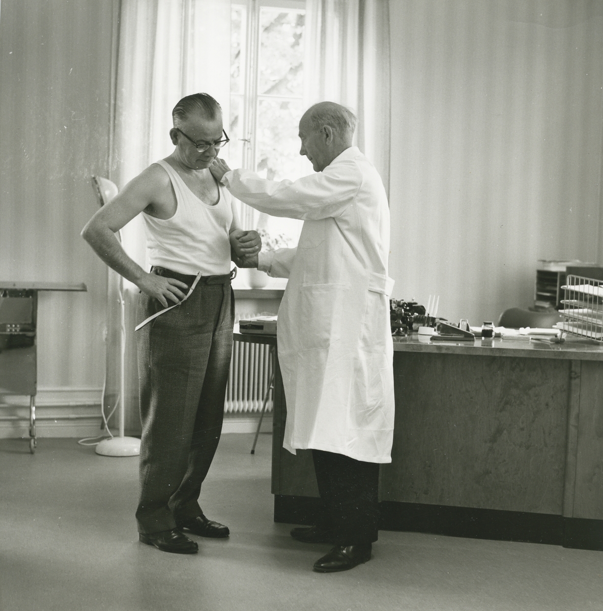Interiör. Sjukrummet, företagshälsovård på Gustavsbergs Fabriker.. Läkarundersökning av anställd.