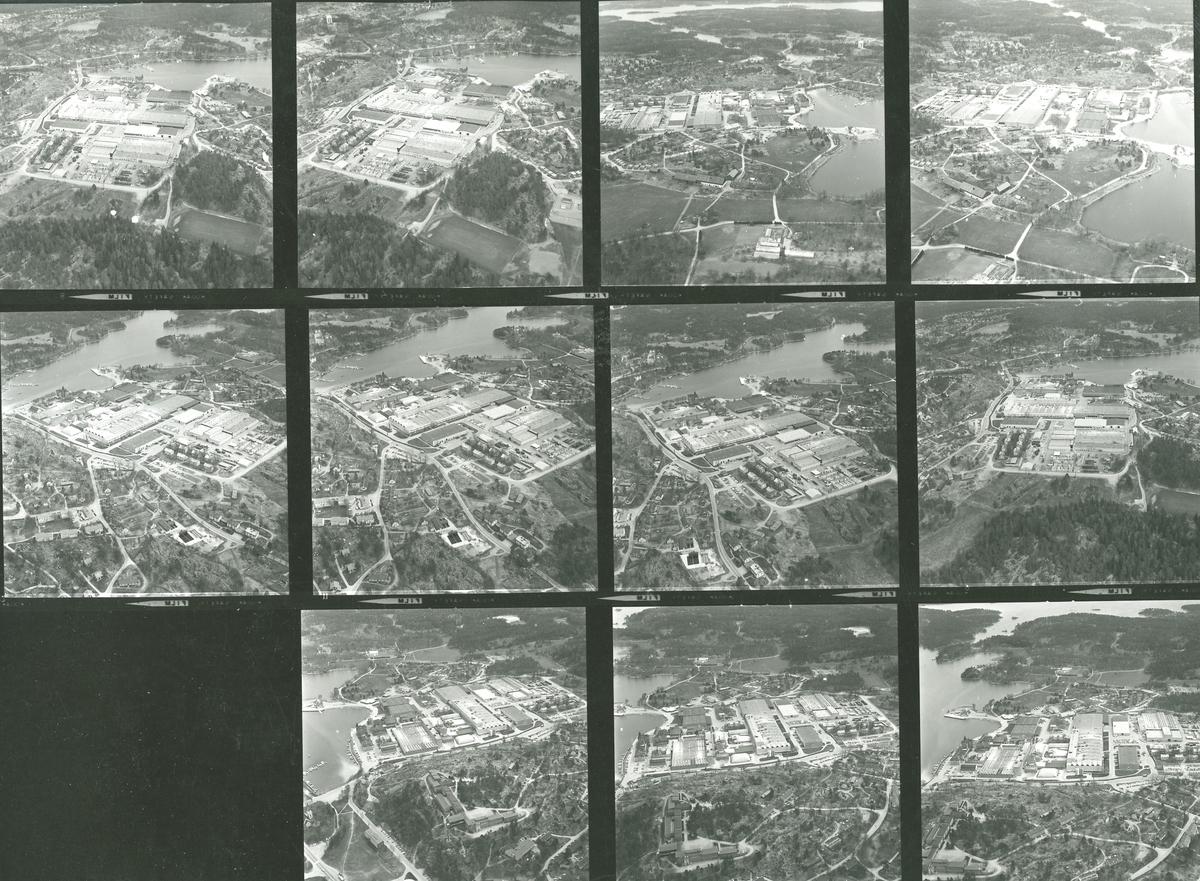 Exteriör. Flygfoton över Gustavsbergs fabriksområde med omnejd och del av Farstaviken.