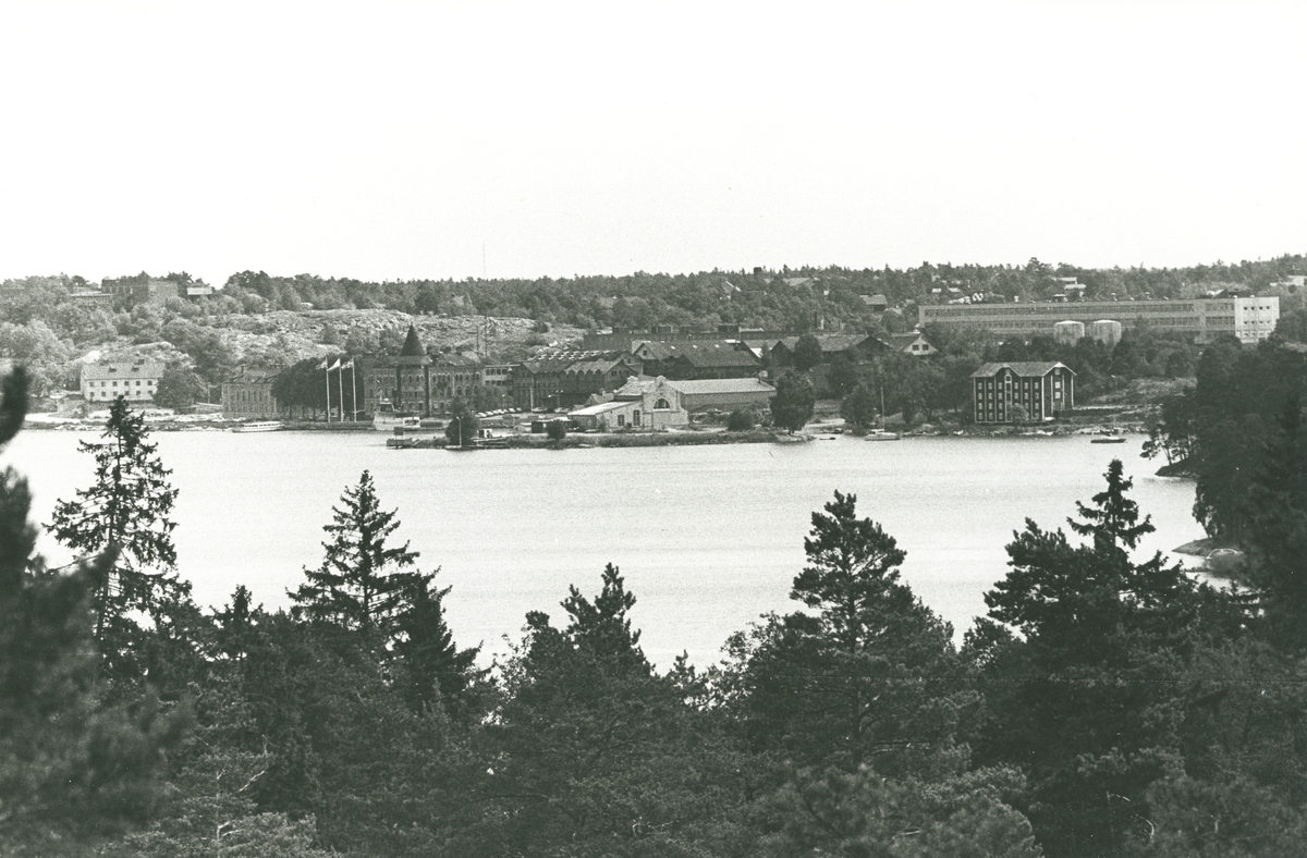 Exteriör. På bilden syns sanitetsporslinsfabriken som började byggas efter 1937. Den höga skorstenen på Kattholmen är borta, m.m.