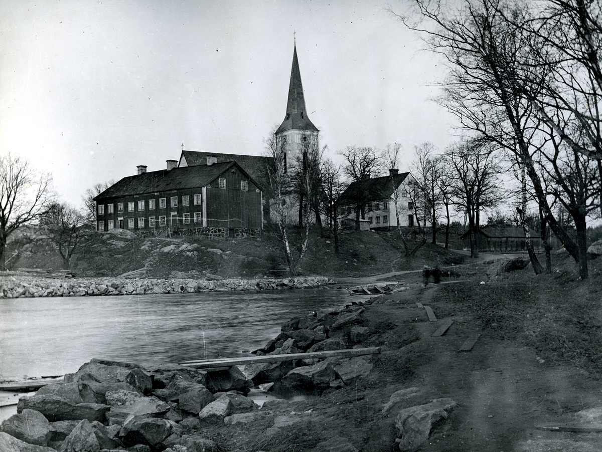 Statbyggningen till vänster, den nybyggda Gustavsbergs kyrka i mitten och Ekensberg till höger, vy från Farstaviken.