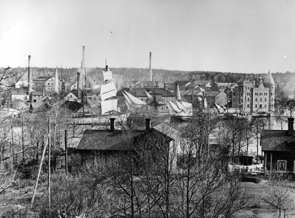 Titel: Vy mot Gustavsbergs hamn från norr, Franska byggena i förgrunden.