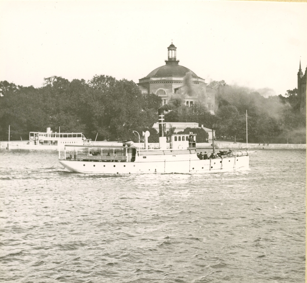 Sommarbild Gustavsbergsbåt med Skeppsholmskyrkan i bakgrunden.
