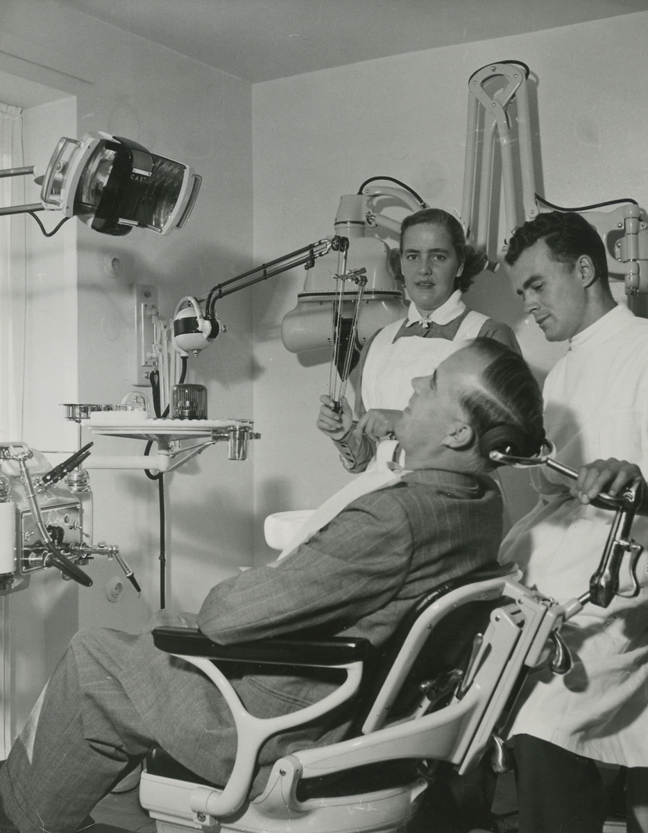 Tandläkare med sköterska och patient. Privatmottagning i radhus, Hästhagen.