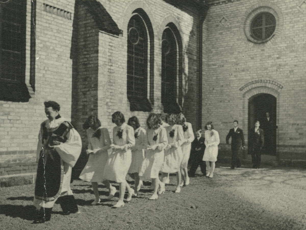 Personer: Komminister Johan Movinger i täten och okända personer.