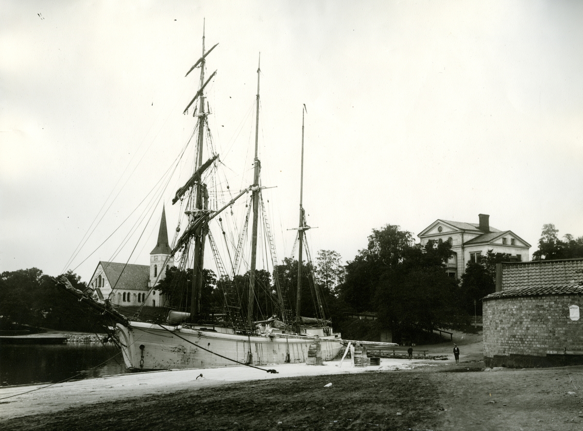 Skonare vid lastkajen. Gustavsbergs kyrka i bakgrunden, färdigställd 1907. Till höger i bakgrunden skymtar Värdshuset.